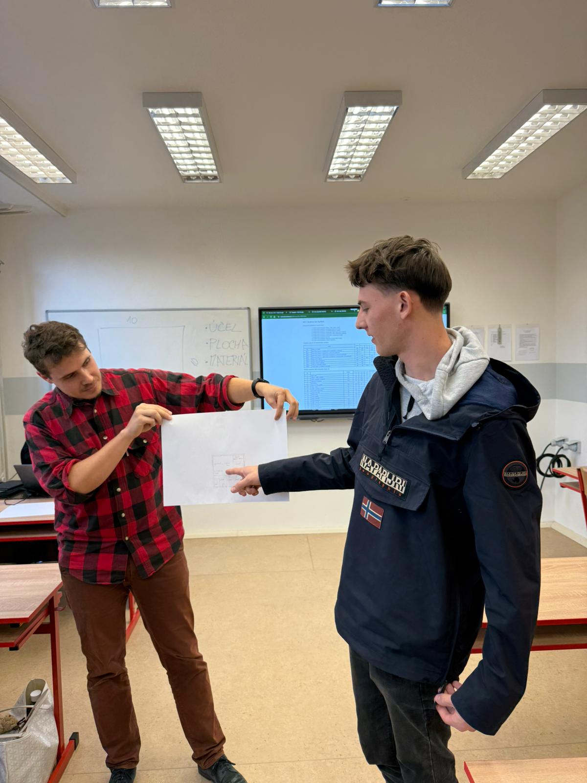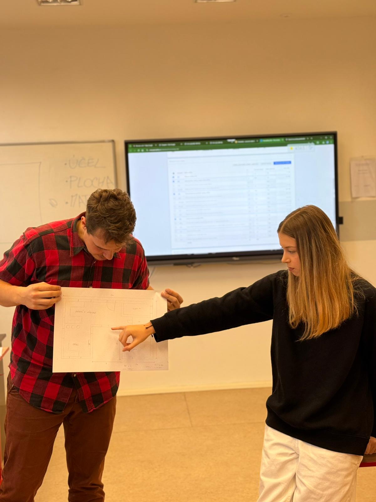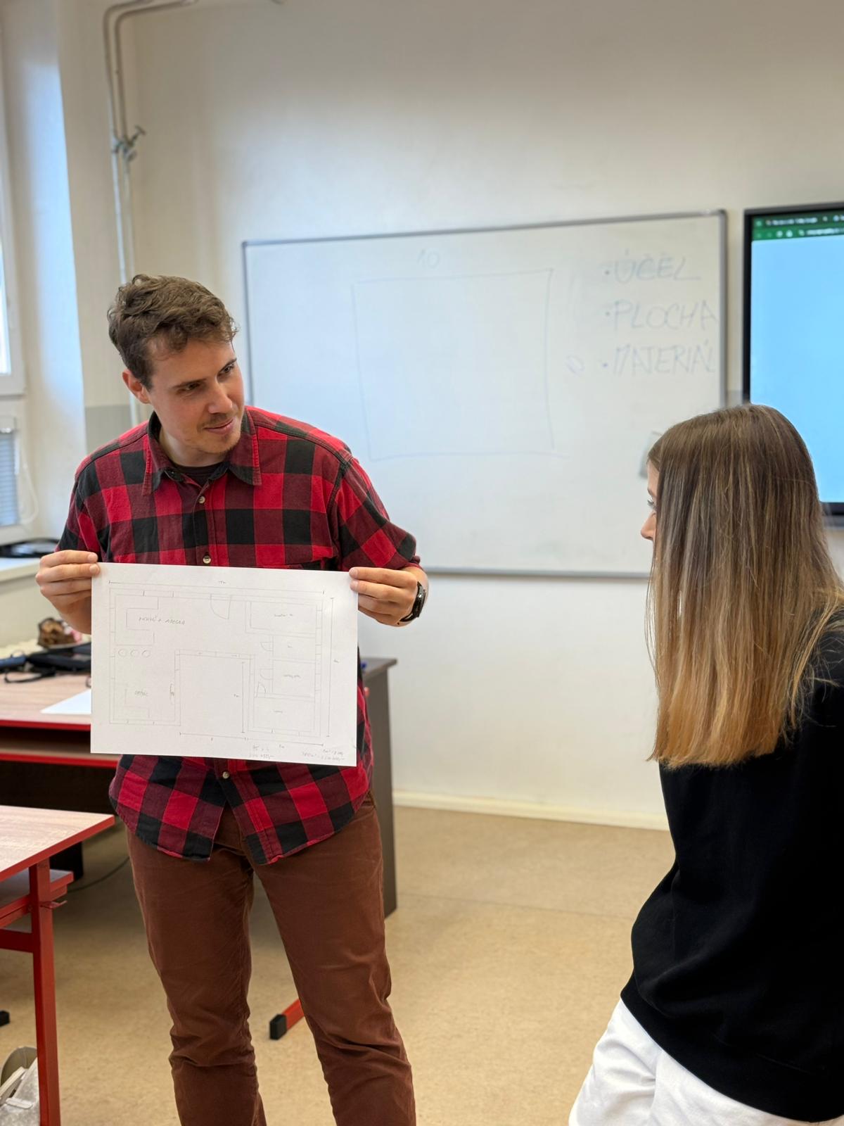 Ve druhé části se studenti zapojili do praktického úkolu. Ve skupinách navrhli dispozice rodinného domu nebo bytu, vypočítali obestavěný prostor, určili cenu celé stavby a následně odhadli i cenu za svou práci v roli projektanta.