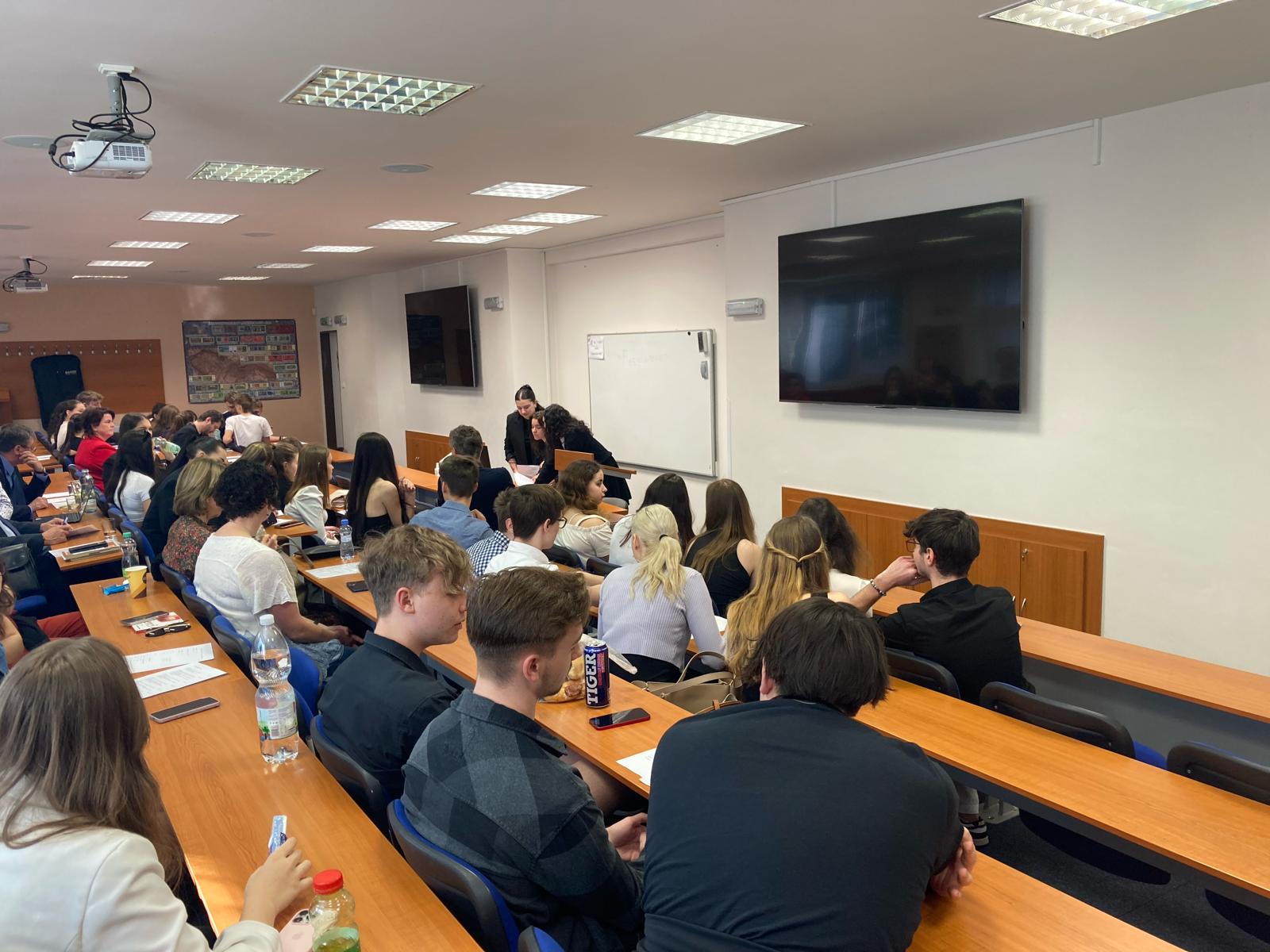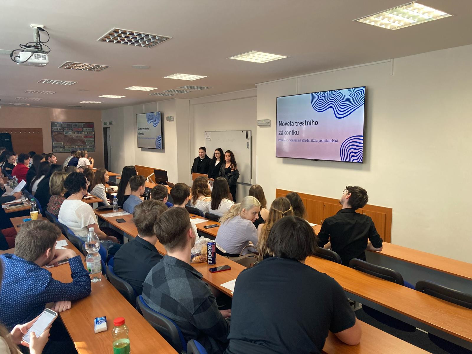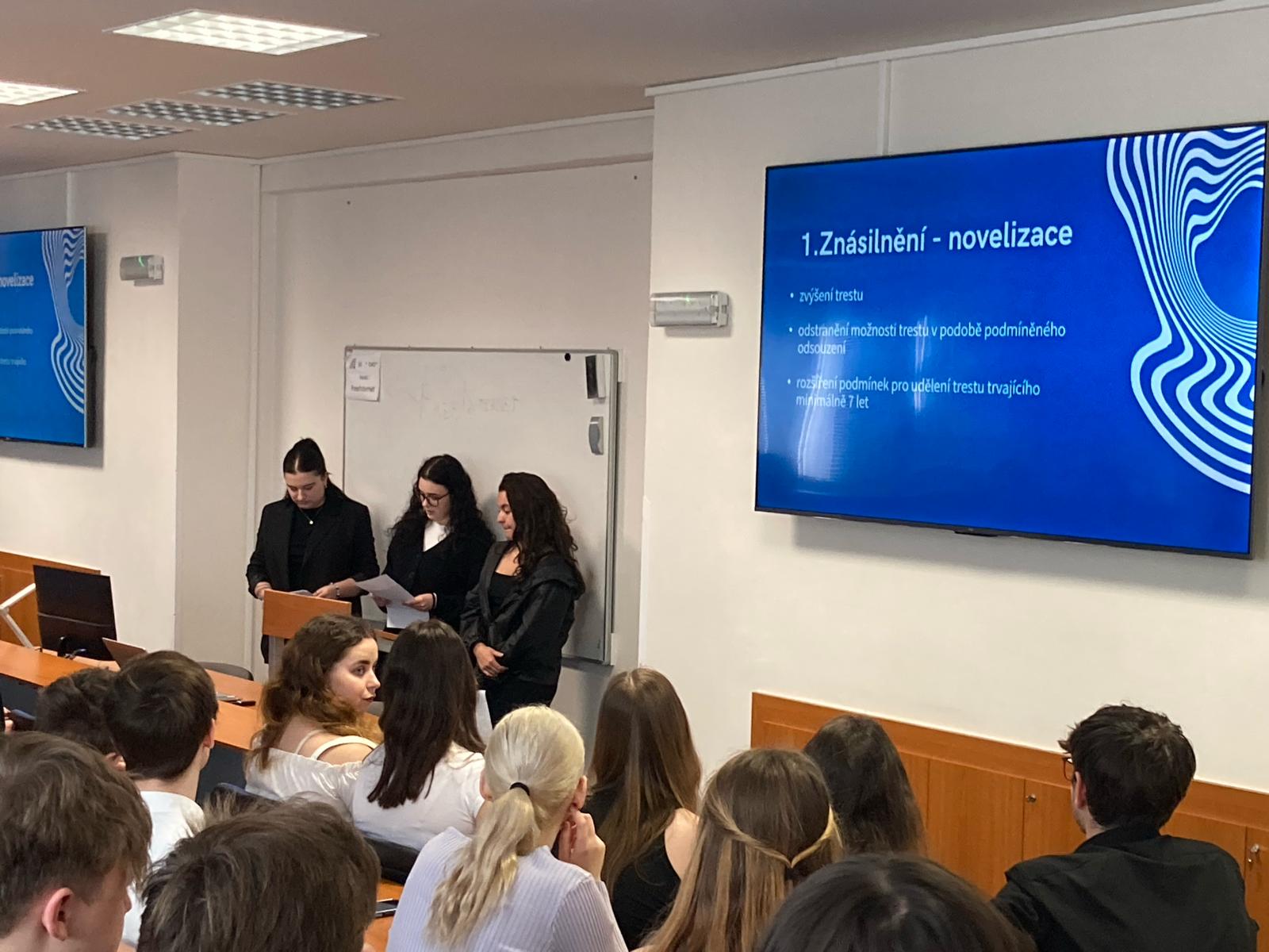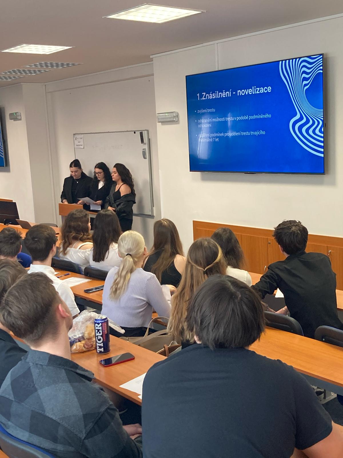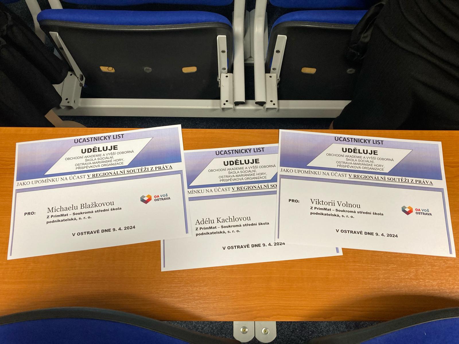 Naše škola vyslala své zástupce Míšu, Adélu a Viki na Regionální soutěž z práva v Ostravě. Letošního ročníku se zúčastnilo celkem 11 týmů ze škol celého Moravskoslezského kraje. Mezi hlavní odborná témata patřila novelizace v oblasti trestního práva, občanského práva a další aktuální otázky, jako je finanční gramotnost, sociální právo nebo školství a vzdělávání. Studenti se museli nejen prezentovat svým návrhem zákona, ale také se popasovat s testem z problematiky základů práva a obecného společenského přehledu.