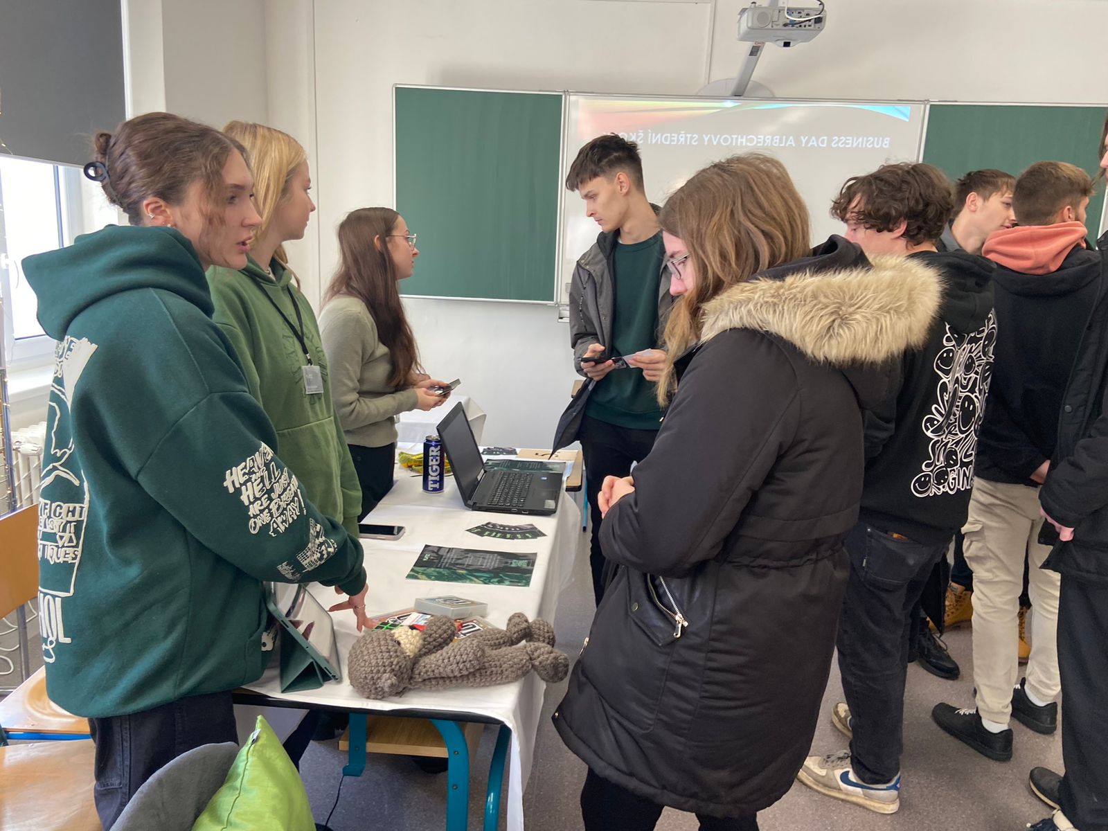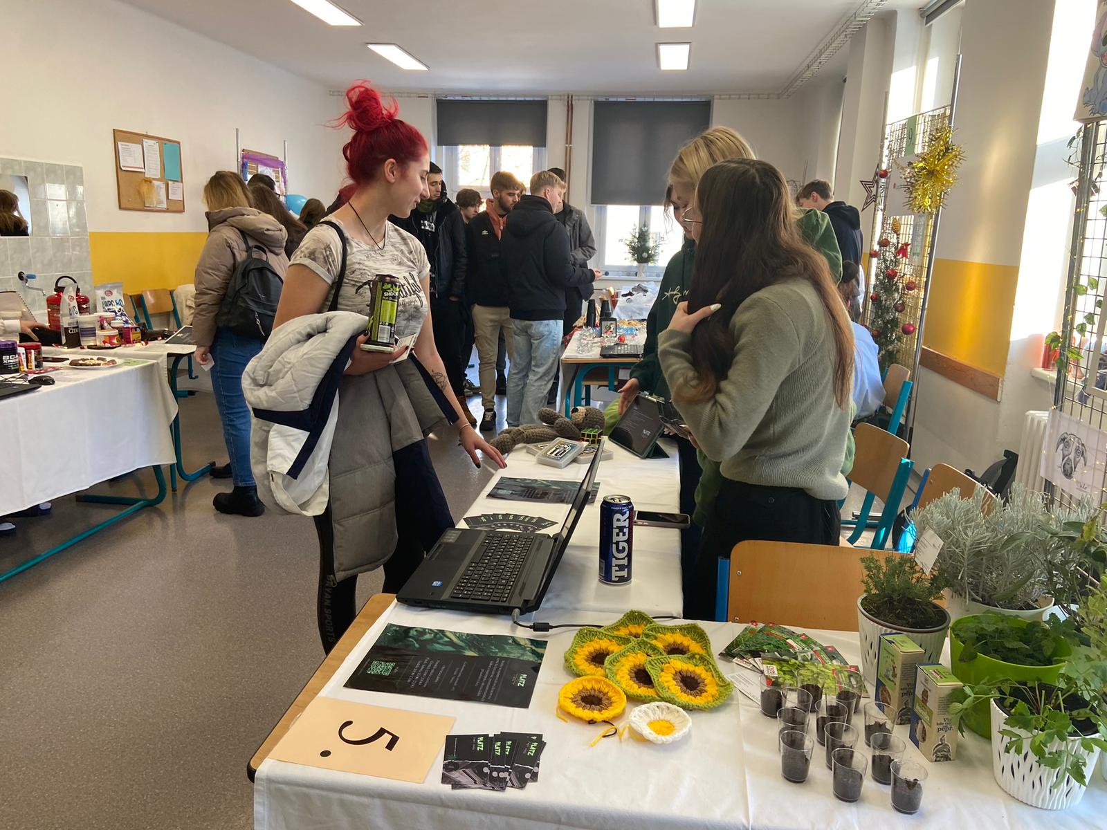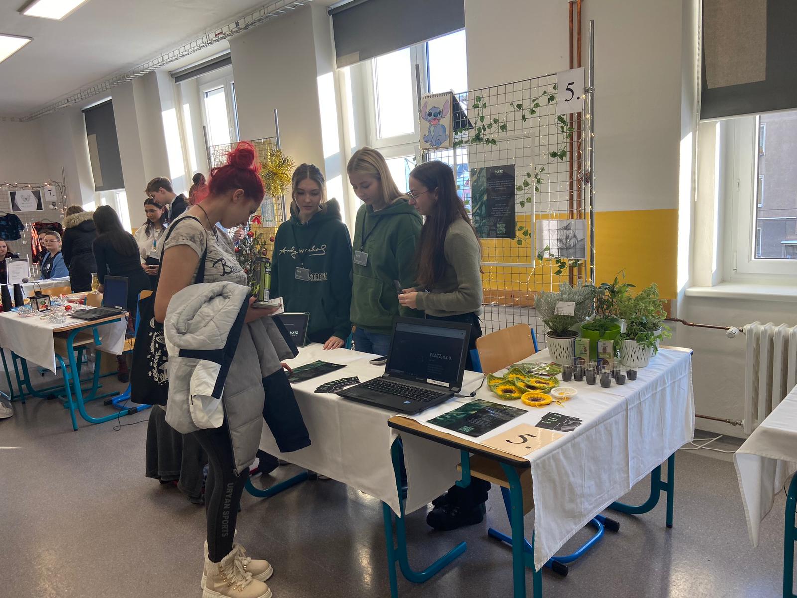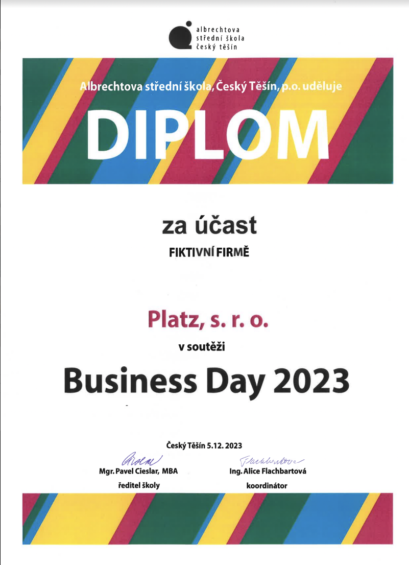 Tým studentek z 3. ročníku se zúčastnil Veletrhu fiktivních firem v Českém Těšíně. Naši školu PrimMat reprezentovala firma Platz s.r.o., která se zabývá rozvíjením kreativity začínajících podnikatelů a umělců. Pořádá také výstavy a workshopy. Tuto firmu zastupovaly Barbora Kluzová, Klára Krenželoková a Aneta Kukuczková. Studentky skončily na hezkém 4. místě.